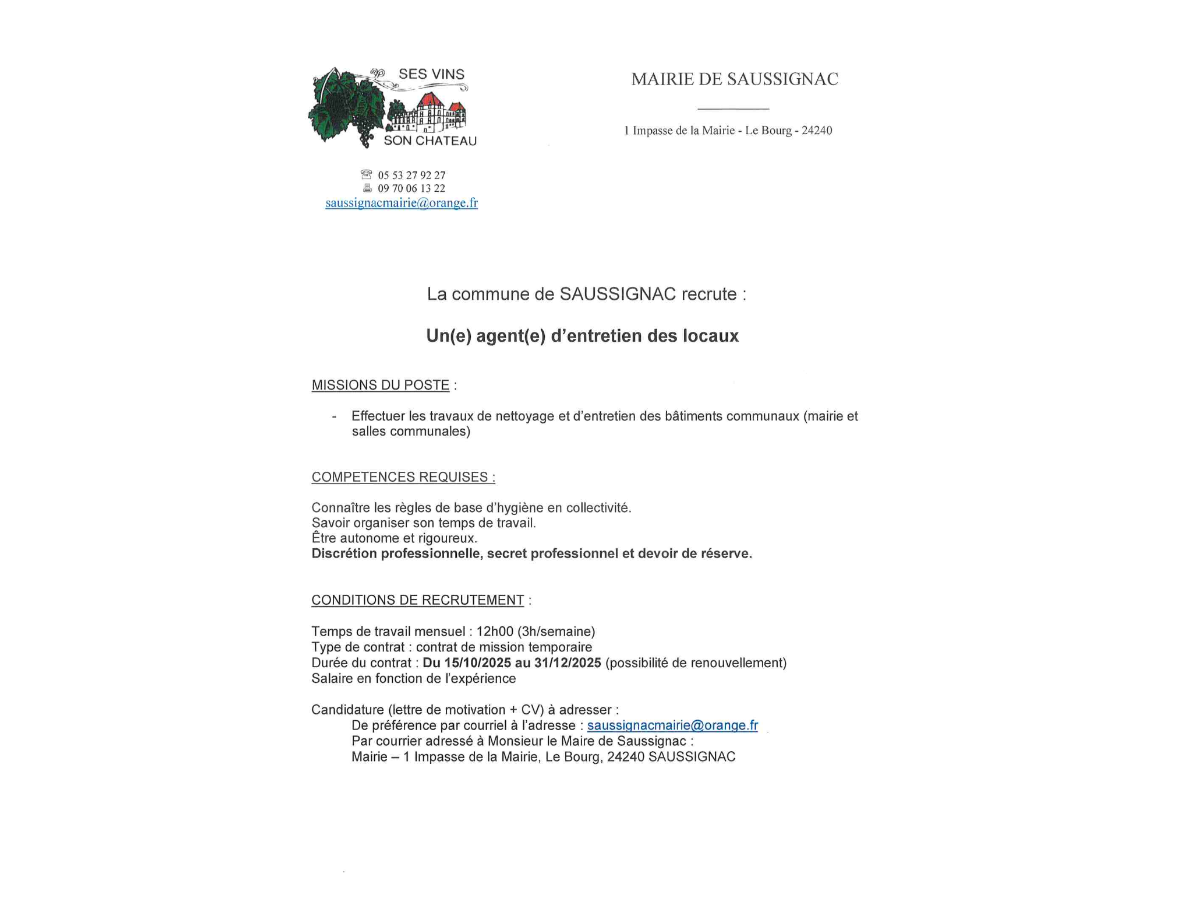 La commune de SAUSSIGNAC recherche un(e) agent(e) d'entretien des locaux.