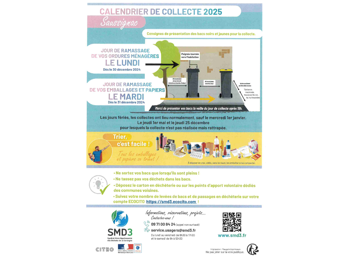 Jour de ramassage de vos ordures ménagères: LE LUNDI (dès le 30/12/24) Jour de ramassage de vos emballages et papiers: LE MARDI (dès le 31/12/24)