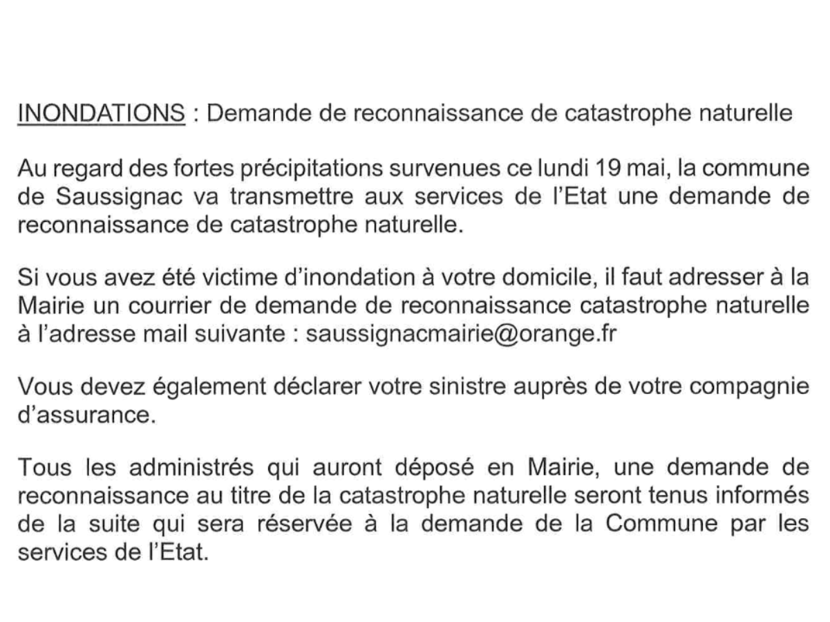 Victime d'inondation à votre domicile? merci d'adresser votre demande de reconnaissance catastrophe naturelle par mail: saussignacmairie@orange.fr