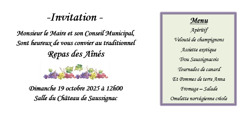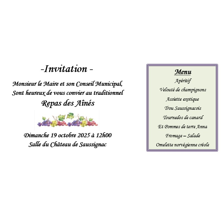 Monsieur le Maire et son Conseil municipal ont le plaisir d'offrir à tous les séniors (âgés de 70 ans et +) un repas traditionnel.
